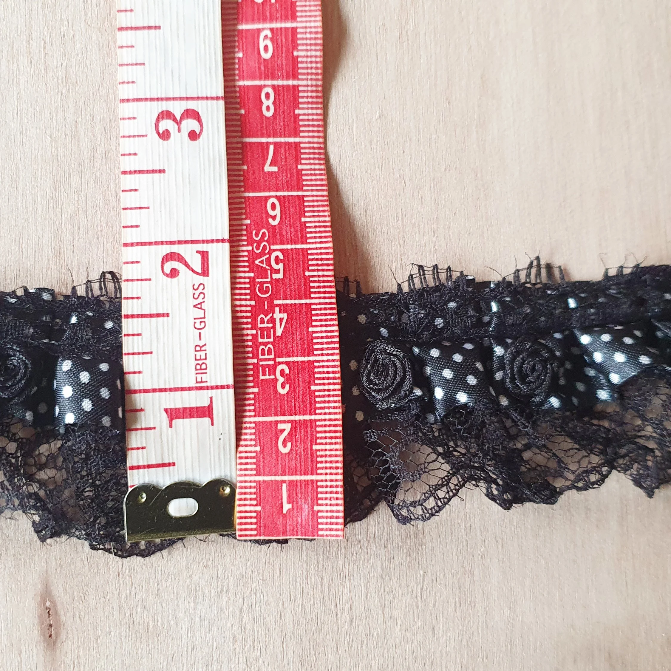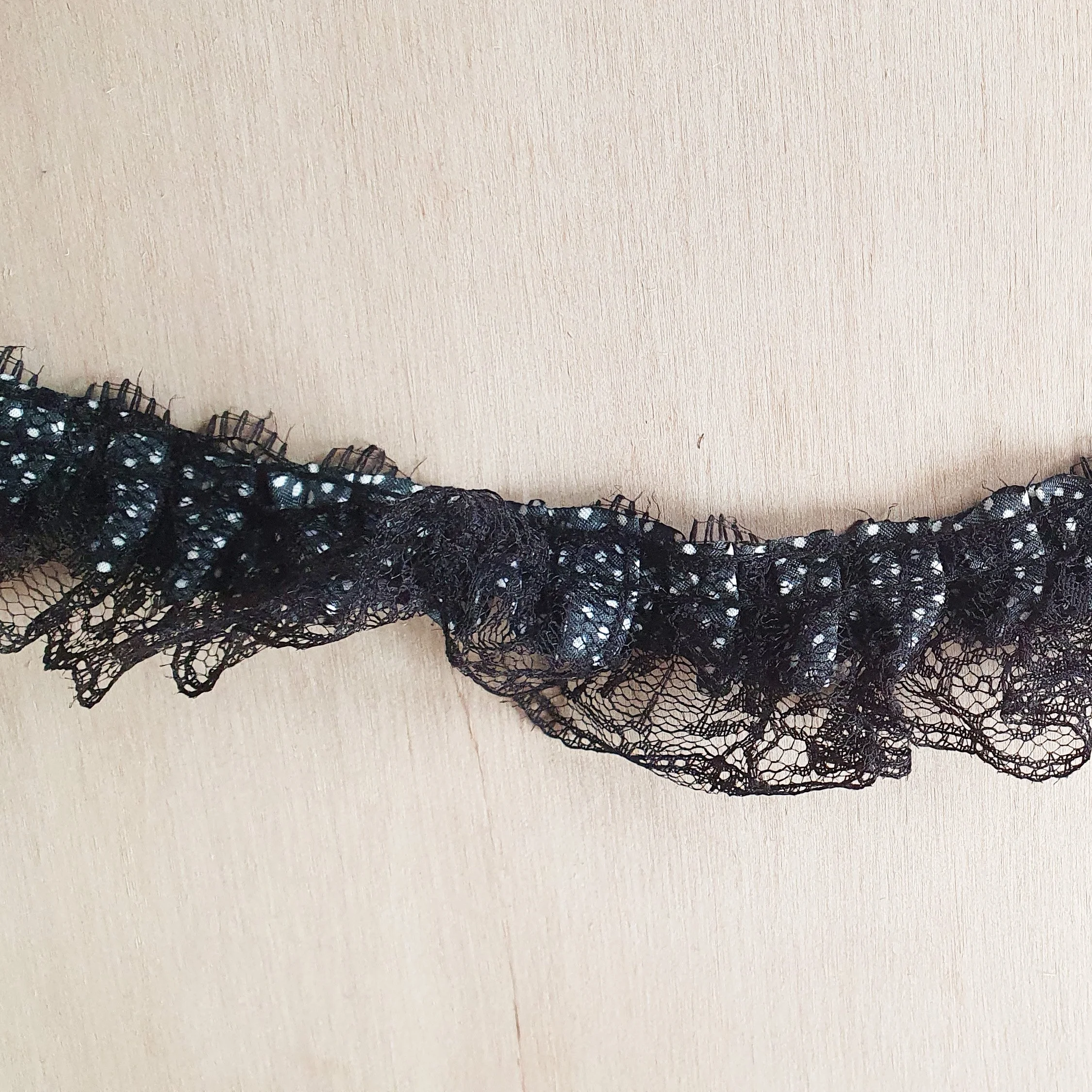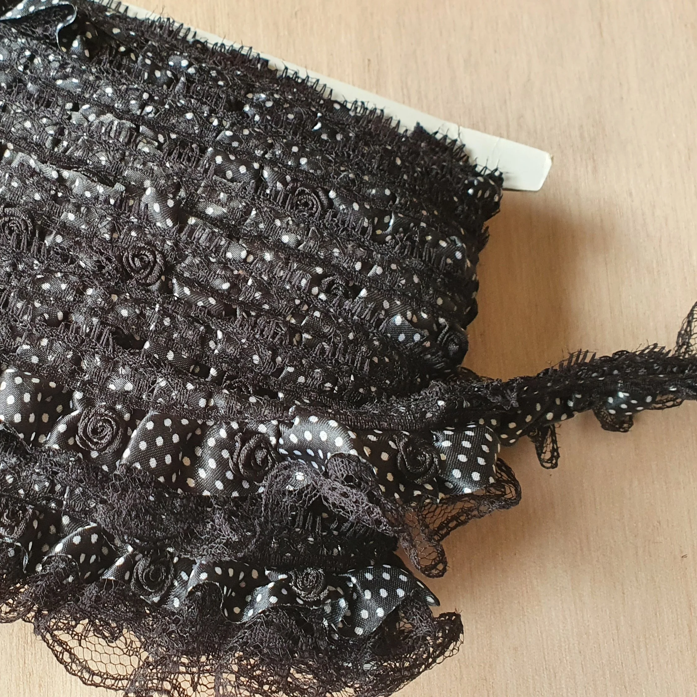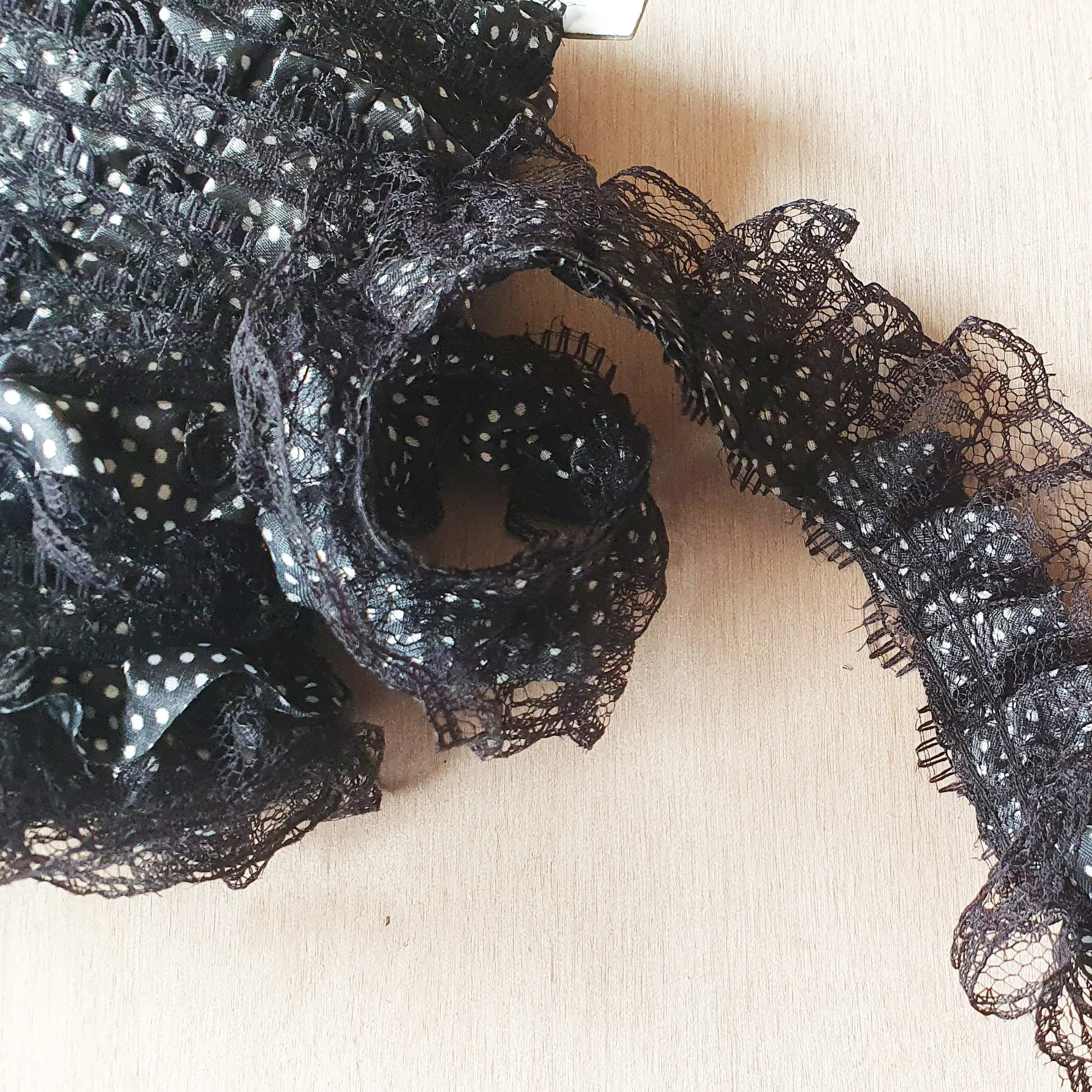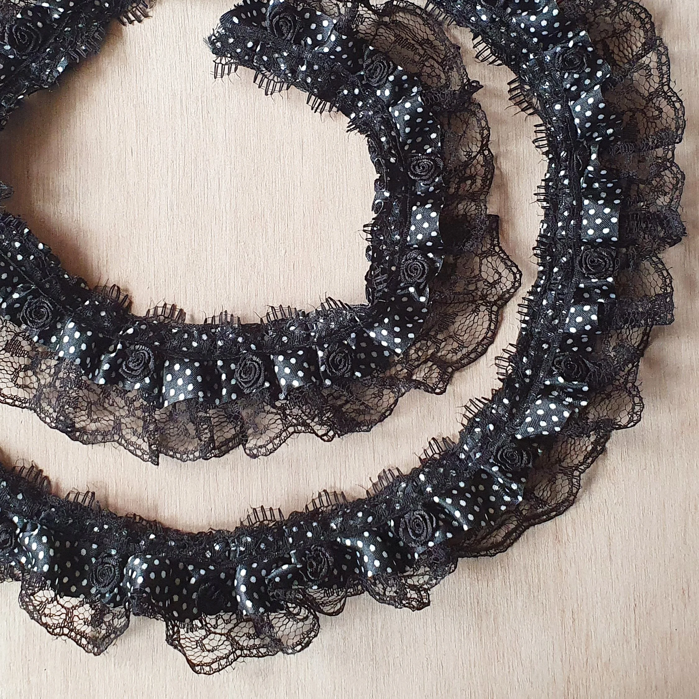 This is a cute ruffled lace in black and white with polkadot ribbon and little roses.